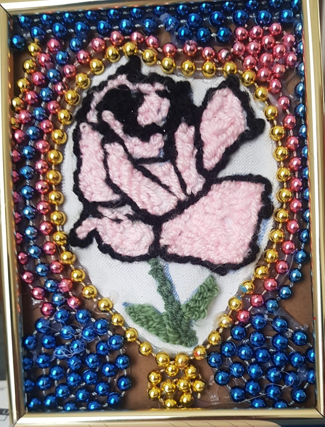 This one-of-a-kind rose embroidery is framed and decorated with colourful beads(blue, gold,red and pink). Every detail is made with love and passion, turning this piece into a work of art that brings beauty and warmth to any home. Perfect as a heartfelt gift for someone special or as a unique decoration to brighten up your favourite space.