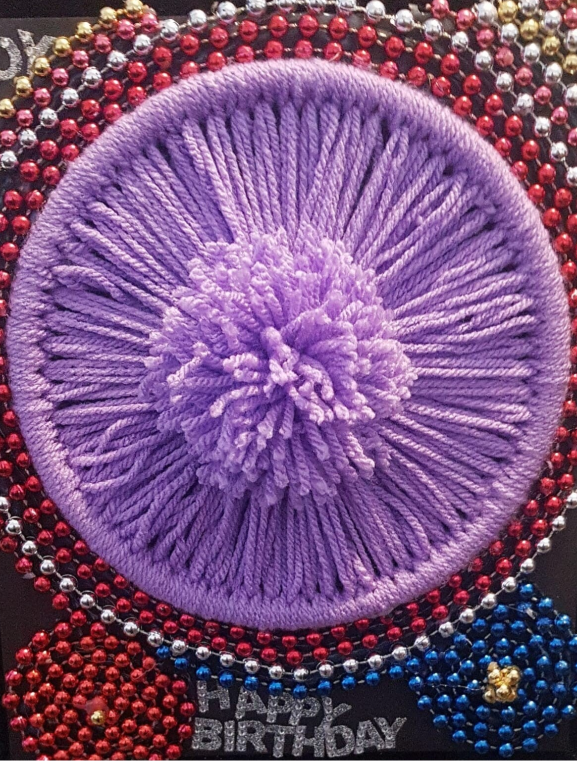 The image features a purple yarn ball adorned with beads, set on top of a black box. It is associated with a birthday theme. The tags emphasize its artistic qualities, highlighting the colors violet and purple, as well as patterns related to the piece.